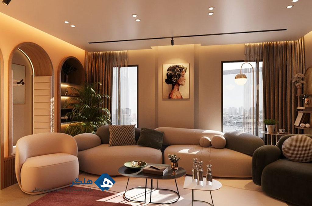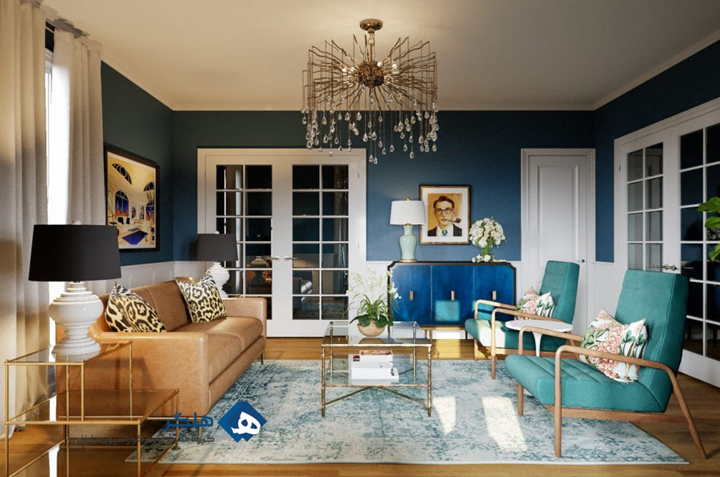 - ترکیب بافتها و الگوهای مختلف به طراحی عمق و جذابیت میافزاید. از پارچههای نرم، فرشهای زیبا و تابلوهای هنری استفاده کنید.