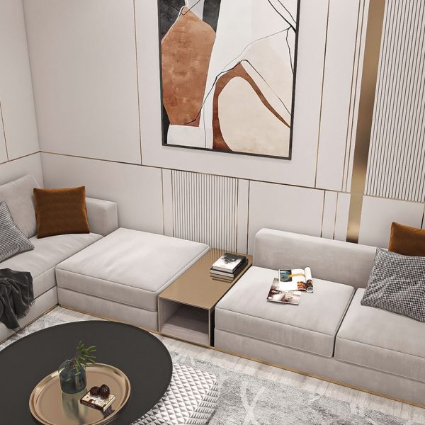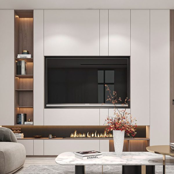 ازین رو طیف سفید برای جداکننده های داخلی و قسمت هایی از فضا انتخاب شد و رنگ شکلاتی برای میزها و قسمتی از پشت دیواره ی تی وی.